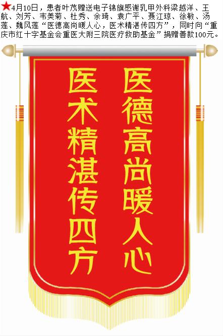 患者叶茂赠送电子锦旗感谢乳甲外科梁越洋等人,并向医疗救助基金捐赠善款100元。-锦旗-患者心声-患者服务-重庆医科大学附属第三医院【官方网站】