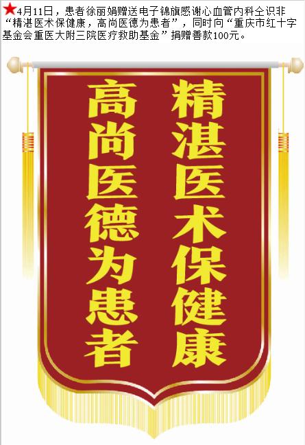 患者徐丽娟赠送电子锦旗感谢心血管内科仝识非,并向医疗救助基金捐赠善款100元。-锦旗-患者心声-患者服务-重庆医科大学附属第三医院【官方网站】