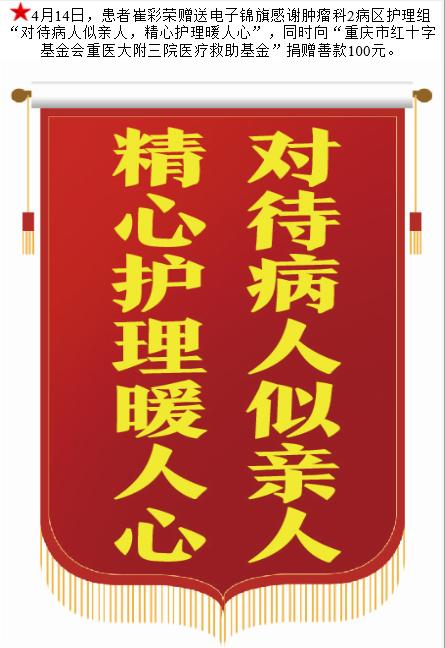 患者崔彩荣赠送电子锦旗感谢肿瘤科2病区护理组,并向医疗救助基金捐赠善款100元。-锦旗-患者心声-患者服务-重庆医科大学附属第三医院【官方网站】