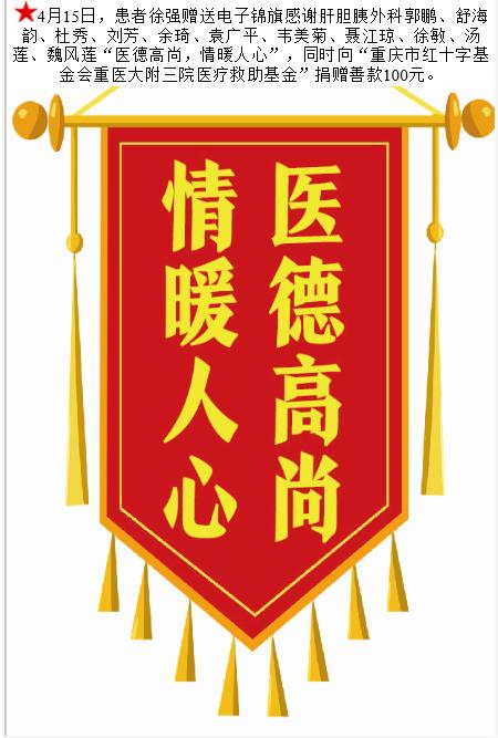 患者徐强赠送电子锦旗感谢肝胆胰外科郭鹏等人,并向医疗救助基金捐赠善款100元。-锦旗-患者心声-患者服务-重庆医科大学附属第三医院【官方网站】