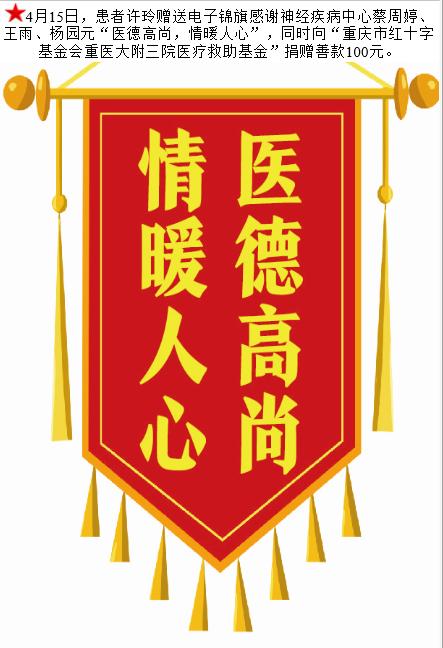 患者许玲赠送电子锦旗感谢神经疾病中心蔡周婷等人,并向医疗救助基金捐赠善款100元。-锦旗-患者心声-患者服务-重庆医科大学附属第三医院【官方网站】