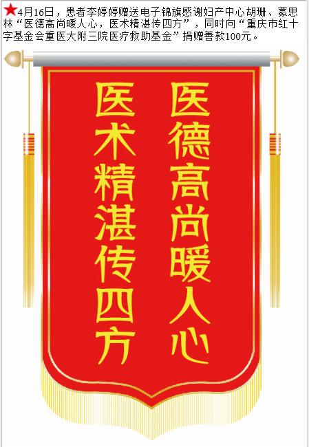患者李婷婷赠送电子锦旗感谢妇产中心胡珊等人,并向医疗救助基金捐赠善款100元。-锦旗-患者心声-患者服务-重庆医科大学附属第三医院【官方网站】