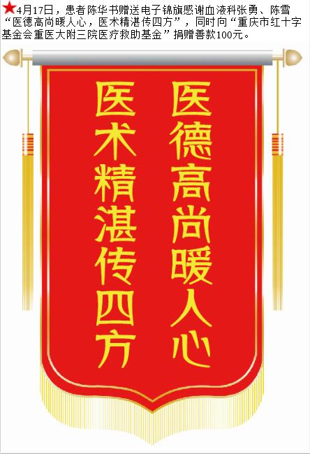 患者陈华书赠送电子锦旗感谢血液科张勇等人,并向医疗救助基金捐赠善款100元。-锦旗-患者心声-患者服务-重庆医科大学附属第三医院【官方网站】