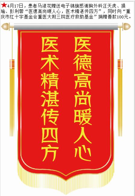 患者马淑花赠送电子锦旗感谢胸外科汪天虎等人,并向医疗救助基金捐赠善款100元。-锦旗-患者心声-患者服务-重庆医科大学附属第三医院【官方网站】