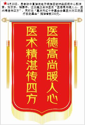 患者陈中富赠送电子锦旗感谢神经疾病中心郭洋君等人,并向医疗救助基金捐赠善款100元。-锦旗-患者心声-患者服务-重庆医科大学附属第三医院【官方网站】