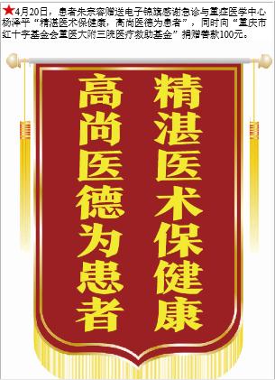 患者朱宗容赠送电子锦旗感谢急诊与重症医学中心杨泽平,并向医疗救助基金捐赠善款100元。-锦旗-患者心声-患者服务-重庆医科大学附属第三医院【官方网站】
