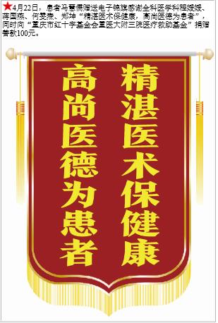 患者马慧儒赠送电子锦旗感谢全科医学科程媛媛等人,并向医疗救助基金捐赠善款100元。-锦旗-患者心声-患者服务-重庆医科大学附属第三医院【官方网站】