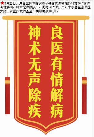 患者王民翠赠送电子锦旗感谢脊柱外科龙游,并向医疗救助基金捐赠善款100元。-锦旗-患者心声-患者服务-重庆医科大学附属第三医院【官方网站】