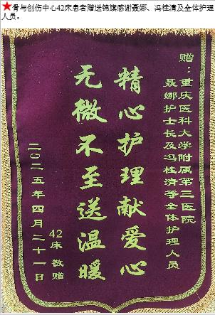 骨与创伤中心42床患者赠送锦旗感谢聂娜、冯桂清及全体护理人员。-锦旗-患者心声-患者服务-重庆医科大学附属第三医院【官方网站】