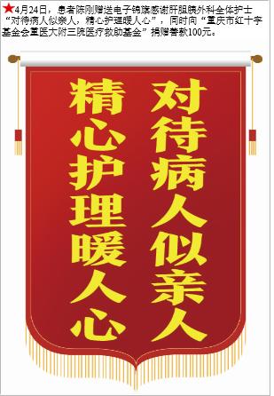 患者陈刚赠送电子锦旗感谢肝胆胰外科全体护士,并向医疗救助基金捐赠善款100元。-锦旗-患者心声-患者服务-重庆医科大学附属第三医院【官方网站】