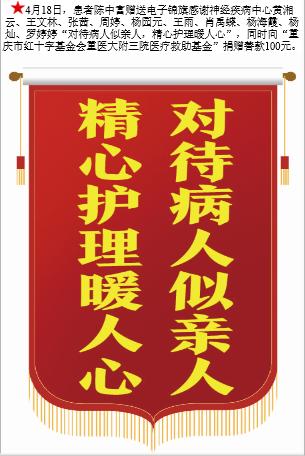 患者陈中富赠送电子锦旗感谢神经疾病中心黄湘云等人,并向医疗救助基金捐赠善款100元。