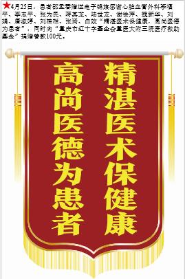 患者邵孟春赠送电子锦旗感谢心脏血管外科李福平等人,并向医疗救助基金捐赠善款100元。-锦旗-患者心声-患者服务-重庆医科大学附属第三医院【官方网站】