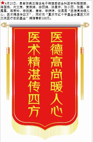 患者陈美兰赠送电子锦旗感谢全科医学科程媛媛等人,并向医疗救助基金捐赠善款100元。-锦旗-患者心声-患者服务-重庆医科大学附属第三医院【官方网站】