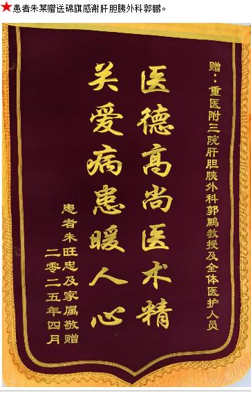 患者朱某赠送锦旗感谢肝胆胰外科郭鹏及全体医护人员。-锦旗-患者心声-患者服务-重庆医科大学附属第三医院【官方网站】