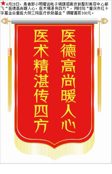 患者郭小明赠送电子锦旗感谢肤整形美容中心郝飞,并向医疗救助基金捐赠善款100元。-锦旗-患者心声-患者服务-重庆医科大学附属第三医院【官方网站】