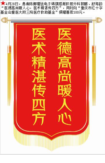 患者陈娜赠送电子锦旗感谢肝胆外科郭鹏等人,并向医疗救助基金捐赠善款100元。-锦旗-患者心声-患者服务-重庆医科大学附属第三医院【官方网站】