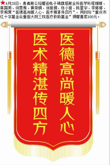 患者谢公裕赠送电子锦旗感谢全科医学科程媛媛等人,并向医疗救助基金捐赠善款100元。-锦旗-患者心声-患者服务-重庆医科大学附属第三医院【官方网站】