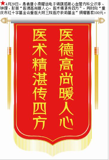 患者唐小燕赠送电子锦旗感谢心血管内科仝识非等人,并向医疗救助基金捐赠善款100元。-锦旗-患者心声-患者服务-重庆医科大学附属第三医院【官方网站】