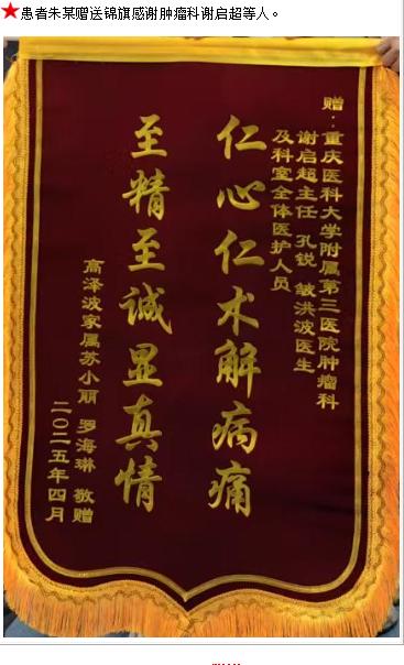 患者朱某赠送锦旗感谢肿瘤科谢启超等人。-锦旗-患者心声-患者服务-重庆医科大学附属第三医院【官方网站】