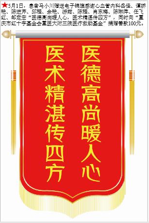 患者马小川赠送电子锦旗感谢心血管内科岳佳等人,并向医疗救助基金捐赠善款100元。-锦旗-患者心声-患者服务-重庆医科大学附属第三医院【官方网站】