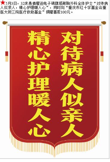 32床患者赠送电子锦旗感谢胸外科全体护士,并向医疗救助基金捐赠善款100元。-锦旗-患者心声-患者服务-重庆医科大学附属第三医院【官方网站】