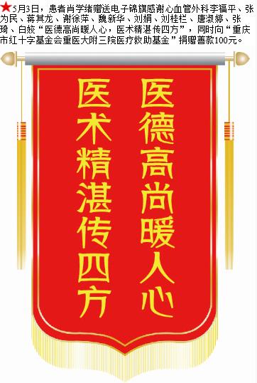 患者肖学绪赠送电子锦旗感谢心血管外科李福平等人,并向医疗救助基金捐赠善款100元。-锦旗-患者心声-患者服务-重庆医科大学附属第三医院【官方网站】