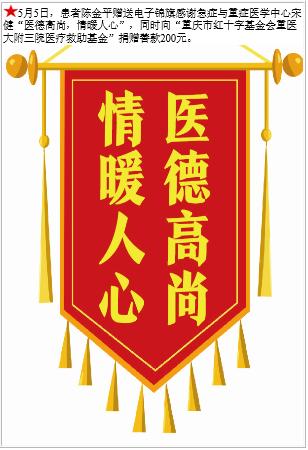 患者陈金平赠送电子锦旗感谢急症与重症医学中心宋健,并向医疗救助基金捐赠善款200元。-锦旗-患者心声-患者服务-重庆医科大学附属第三医院【官方网站】