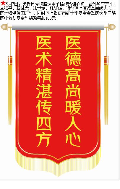 患者傅隆均赠送电子锦旗感谢心脏血管外科李志平等人,并向医疗救助基金捐赠善款100元。-锦旗-患者心声-患者服务-重庆医科大学附属第三医院【官方网站】