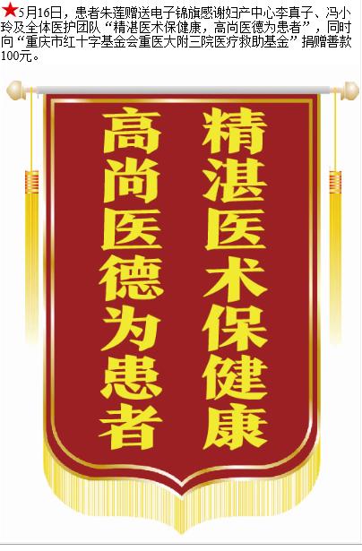 患者朱莲赠送电子锦旗感谢妇产中心李真子等人,并向医疗救助基金捐赠善款100元。-锦旗-患者心声-患者服务-重庆医科大学附属第三医院【官方网站】