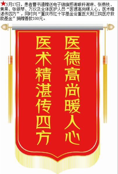 患者曹书通赠送电子锦旗感谢眼科谢琳等人,并向医疗救助基金捐赠善款100元。-锦旗-患者心声-患者服务-重庆医科大学附属第三医院【官方网站】