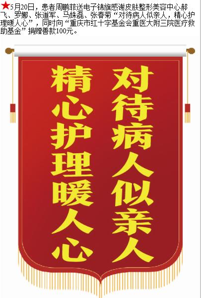 患者周鹏菲赠送电子锦旗感谢皮肤整形美容中心郝飞等人,并向医疗救助基金捐赠善款100元。-锦旗-患者心声-患者服务-重庆医科大学附属第三医院【官方网站】