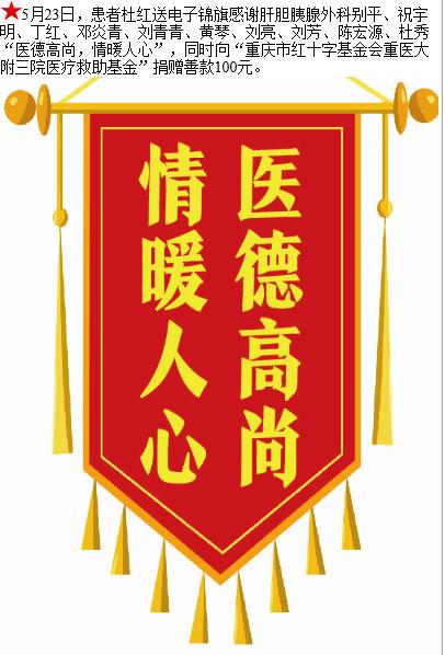 患者杜红赠送电子锦旗感谢肝胆胰腺外科别平等人,并向医疗救助基金捐赠善款100元。-锦旗-患者心声-患者服务-重庆医科大学附属第三医院【官方网站】