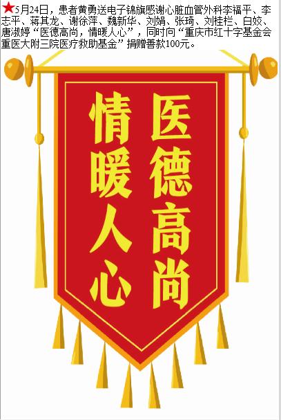 患者黄勇赠送电子锦旗感谢心脏血管外科李福平等人,并向医疗救助基金捐赠善款100元。-锦旗-患者心声-患者服务-重庆医科大学附属第三医院【官方网站】
