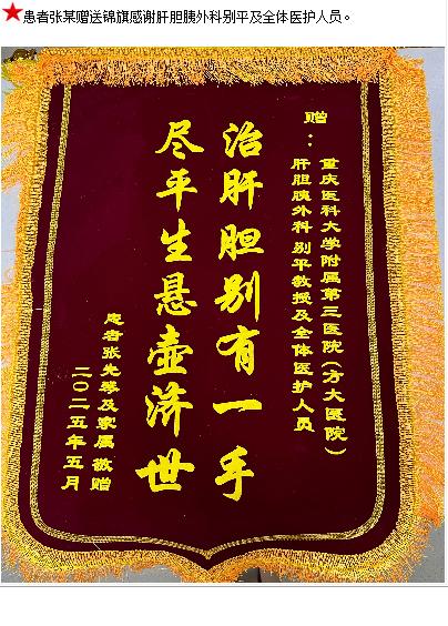 患者张某赠送锦旗感谢肝胆胰外科别平及全体医护人员。-锦旗-患者心声-患者服务-重庆医科大学附属第三医院【官方网站】