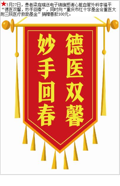 患者梁庭瑞赠送电子锦旗感谢心脏血管外科李福平,并向医疗救助基金捐赠善款100元。-锦旗-患者心声-患者服务-重庆医科大学附属第三医院【官方网站】
