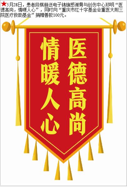 患者段棋赫赠送电子锦旗感谢骨与创伤中心郑明,并向医疗救助基金捐赠善款100元。-锦旗-患者心声-患者服务-重庆医科大学附属第三医院【官方网站】