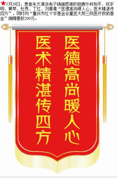 患者朱文渊赠送电子锦旗感谢肝胆胰外科别平等人,并向医疗救助基金捐赠善款100元。-锦旗-患者心声-患者服务-重庆医科大学附属第三医院【官方网站】