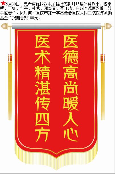 患者康稚钦赠送电子锦旗感谢肝胆胰外科别平等人,并向医疗救助基金捐赠善款100元。-锦旗-患者心声-患者服务-重庆医科大学附属第三医院【官方网站】