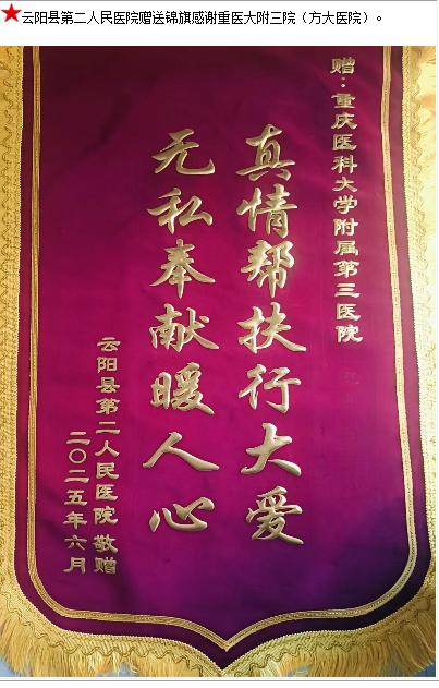 云阳县第二人民医院赠送锦旗感谢重医大附三院(方大医院)。-锦旗-患者心声-患者服务-重庆医科大学附属第三医院【官方网站】