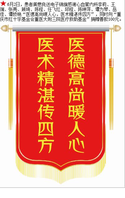 患者龚懋良赠送电子锦旗感谢心血管内科李莉等人,并向医疗救助基金捐赠善款100元。-锦旗-患者心声-患者服务-重庆医科大学附属第三医院【官方网站】