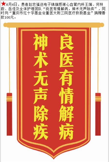 患者赵忠福赠送电子锦旗感谢心血管内科王端等人,并向医疗救助基金捐赠善款100元。-锦旗-患者心声-患者服务-重庆医科大学附属第三医院【官方网站】