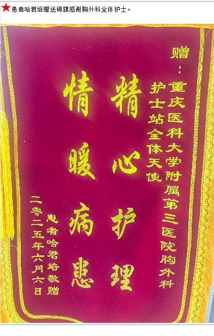 患者哈君培赠送锦旗感谢胸外科全体护士。-锦旗-患者心声-患者服务-重庆医科大学附属第三医院【官方网站】
