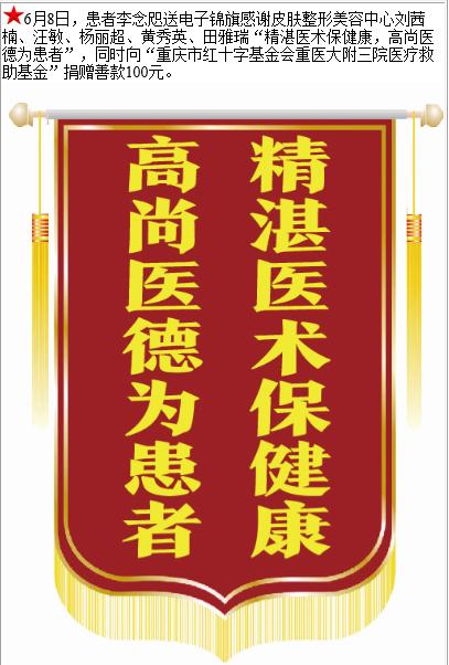 患者李念咫赠送电子锦旗感谢皮肤整形美容中心刘茜楠等人,并向医疗救助基金捐赠善款100元。-锦旗-患者心声-患者服务-重庆医科大学附属第三医院【官方网站】