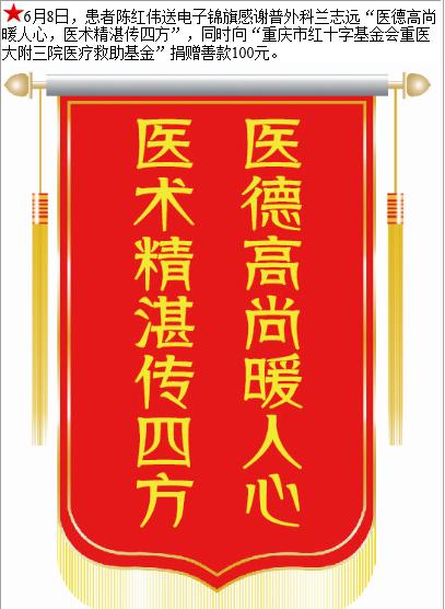 患者陈红伟赠送电子锦旗感谢普外科兰志远,并向医疗救助基金捐赠善款100元。-锦旗-患者心声-患者服务-重庆医科大学附属第三医院【官方网站】