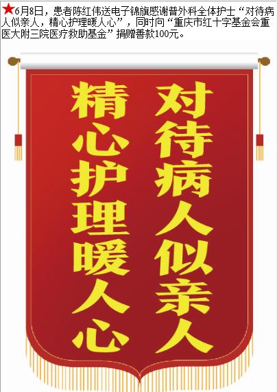 患者陈红伟赠送电子锦旗感谢普外科全体护士,并向医疗救助基金捐赠善款100元。-锦旗-患者心声-患者服务-重庆医科大学附属第三医院【官方网站】