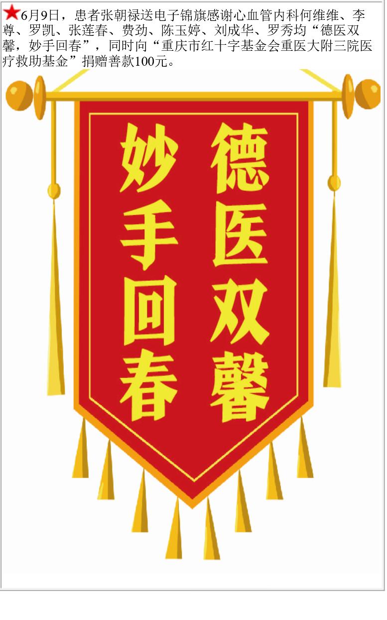 患者张朝禄赠送电子锦旗感谢心血管内科何维维等人,并向医疗救助基金捐赠善款100元。-锦旗-患者心声-患者服务-重庆医科大学附属第三医院【官方网站】