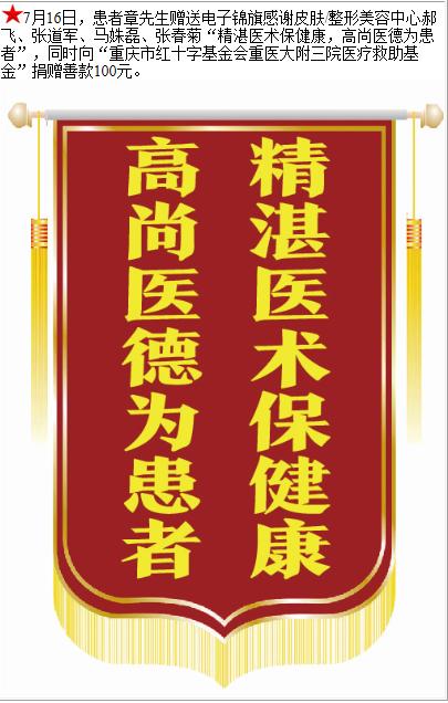 患者章先生赠送电子锦旗感谢皮肤/整形美容中心郝飞等人,并向医疗救助基金捐赠善款100元。-锦旗-患者心声-患者服务-重庆医科大学附属第三医院【官方网站】