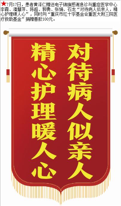 患者黄泽仁赠送电子锦旗感谢急诊与重症医学中心李霞等人,并向医疗救助基金捐赠善款100元。-锦旗-患者心声-患者服务-重庆医科大学附属第三医院【官方网站】
