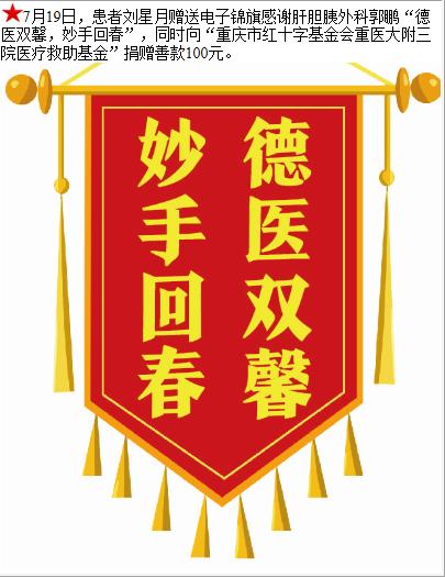 患者刘星月赠送电子锦旗感谢肝胆胰外科郭鹏,并向医疗救助基金捐赠善款100元。-锦旗-患者心声-患者服务-重庆医科大学附属第三医院【官方网站】