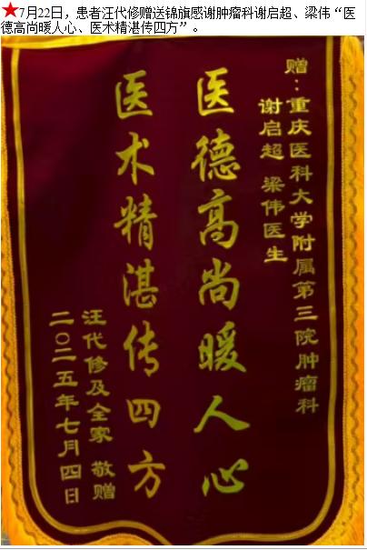 患者汪代修赠送锦旗感谢肿瘤科谢启超等人。-锦旗-患者心声-患者服务-重庆医科大学附属第三医院【官方网站】